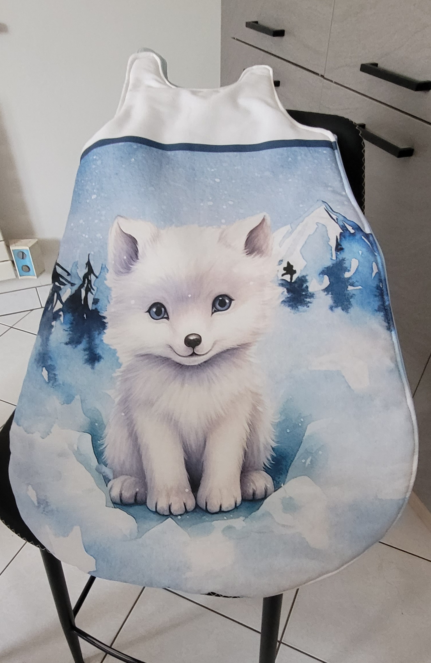 Gigoteuse "Loup Blanc" 29,50 € Ce tissu est 100% coton, certifié Oeko-Tex.70cm x 45cmLavage maximum 30°, NE PAS JAVELLISER